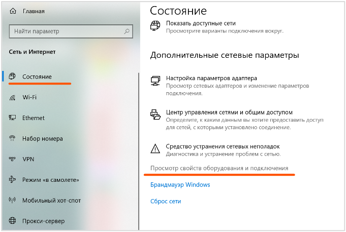 - Перейдите в раздел Сеть и Интернет, затем в Состояние.