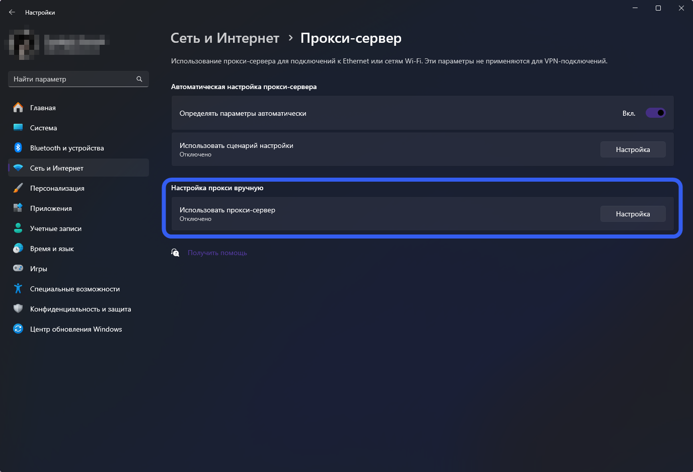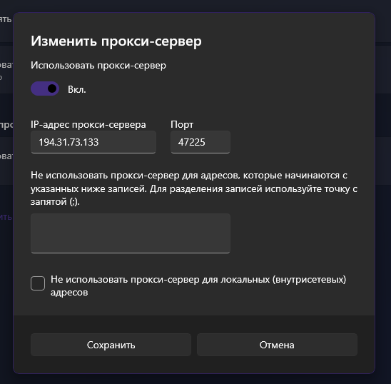 - В разделе «Настройка прокси вручную» активируйте параметр «Использовать прокси-сервер». Затем введите сетевой адрес прокси и его порт. Если хотите, можно настроить список исключений для тех адресов, для которых прокси не будет применяться.