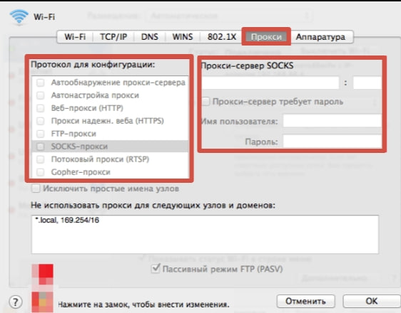 - Поставьте галочку напротив «SOCKS Proxy» (или «SOCKS5»), введите адрес прокси‑серверa и порт (обычно 1080), при необходимости укажите имя пользователя и пароль.