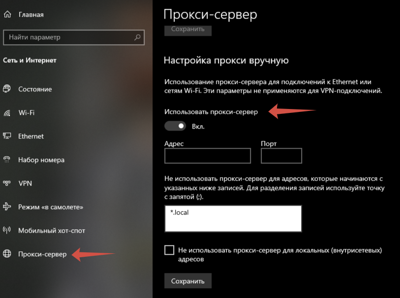 - Откройте «Настройки» → «Сеть и Интернет» → «Прокси».