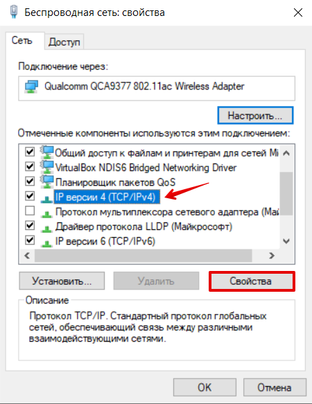 В списке среди доступных элементов выберите "IP версии 4 (TCP/IPv4)" и нажмите "Свойства".
